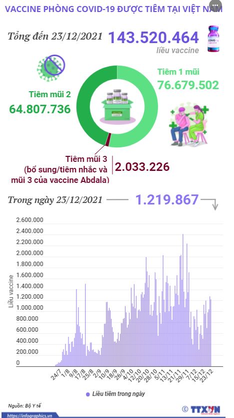 Trong ngày 23/12/2021 có 1.219.867 liều vaccine phòng COVID-19 được tiêm. Như vậy, tổng số liều vaccine đã được tiêm tại Việt Nam là 143.520.464 liều, trong đó tiêm 1 mũi là 76.679.502 liều, tiêm mũi 2 là 64.807.736 và tiêm mũi 3 (tiêm bổ sung/tiêm nhắc và mũi 3 của vaccine Abdala) là 2.033.226 liều.