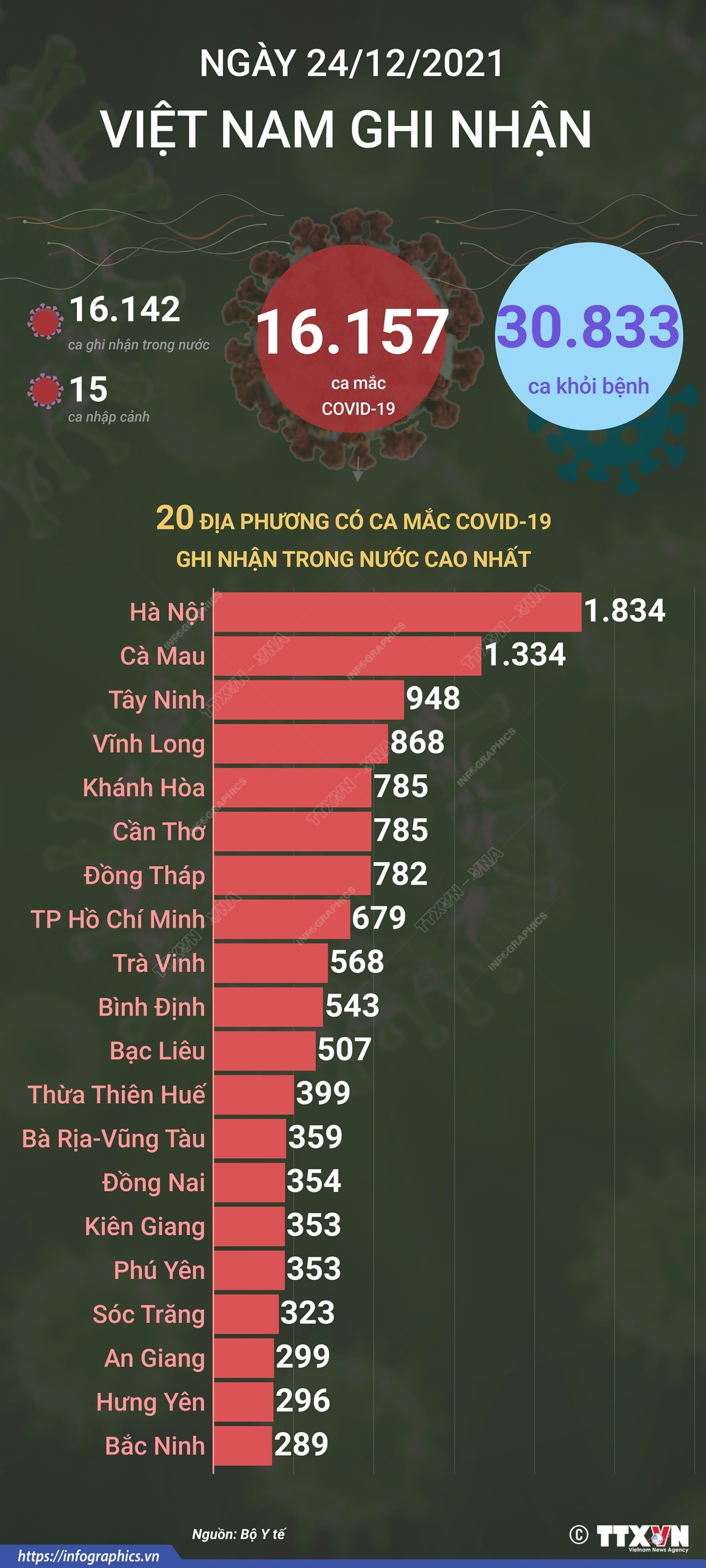 Tính từ 16h ngày 23/12 đến 16h ngày 24/12/2021, Việt Nam ghi nhận 16.157 ca mắc mới COVID-19, trong đó 15 ca nhập cảnh và 16.142 ca trong nước tại 62 tỉnh, thành phố.