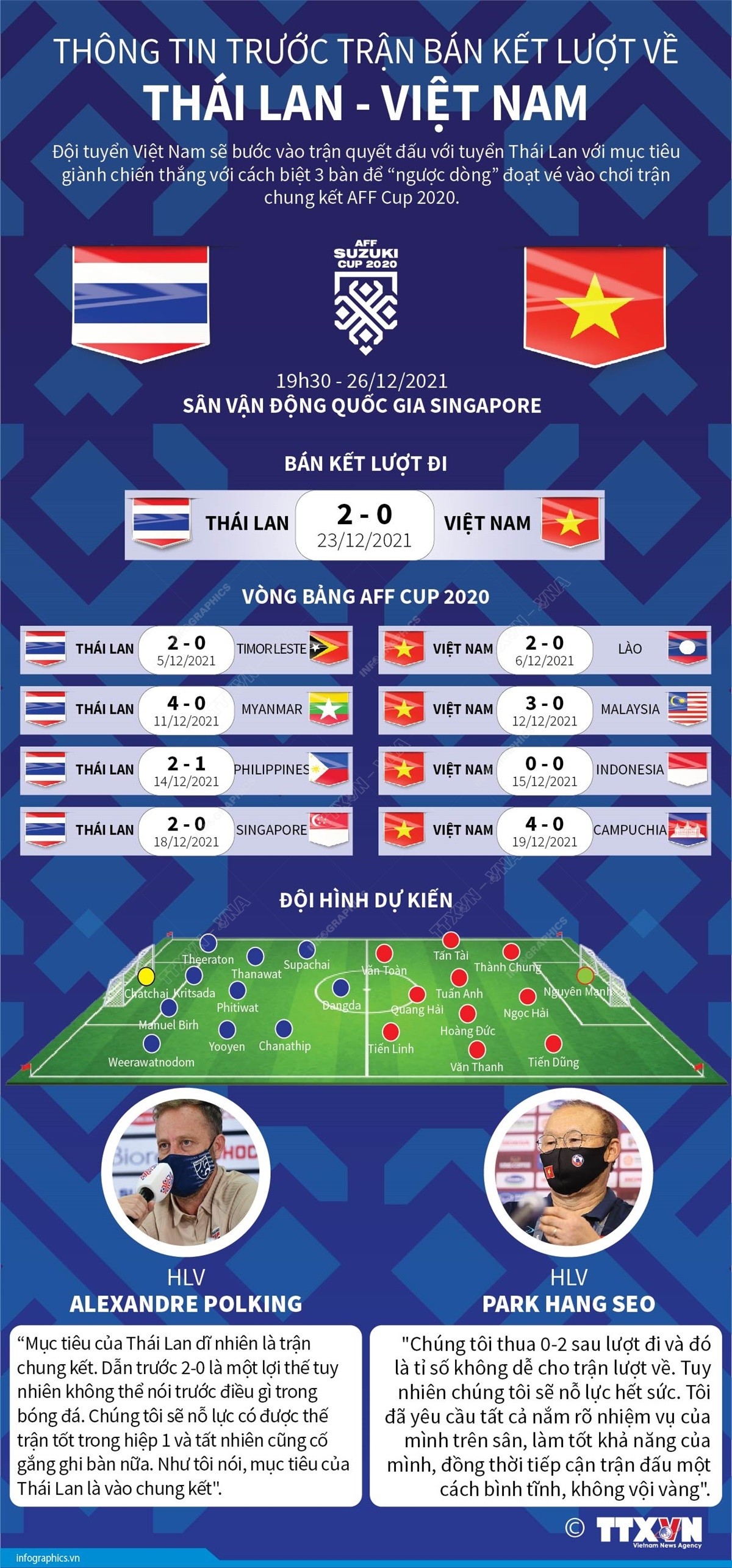 Trận bán kết lượt về AFF Cup 2020 giữa đội tuyển Việt Nam và Thái Lan diễn ra vào 19h30 ngày 26/12/2021. Ở trận lượt đi, đội tuyển Việt Nam thua Thái Lan 0-2. Mặc dù được dự báo sẽ gặp nhiều khó khăn trong trận lượt về, nhưng đội tuyển Việt Nam vẫn giữ vững tinh thần và quyết tâm sẽ làm nên cuộc ngược dòng trước Thái Lan.
