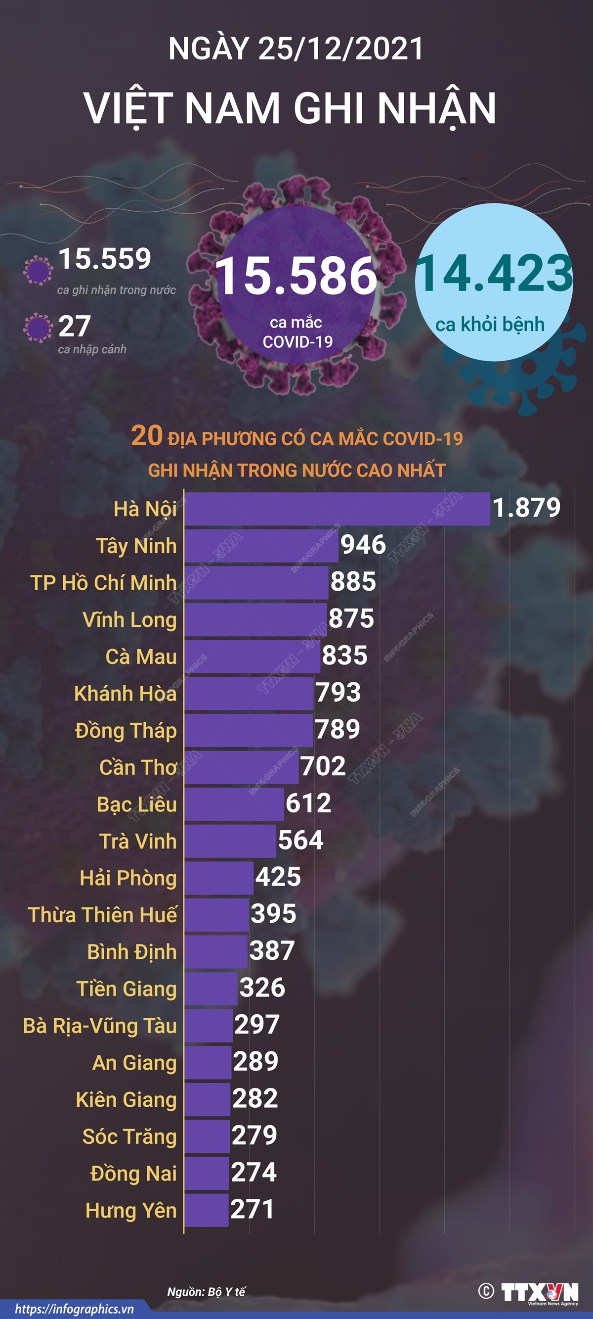 Tính từ 16h ngày 24/12 đến 16h ngày 25/12/2021, Việt Nam ghi nhận 15.586 ca mắc mới COVID-19, trong đó 27 ca nhập cảnh và 15.559 ca trong nước tại 57 tỉnh, thành phố.