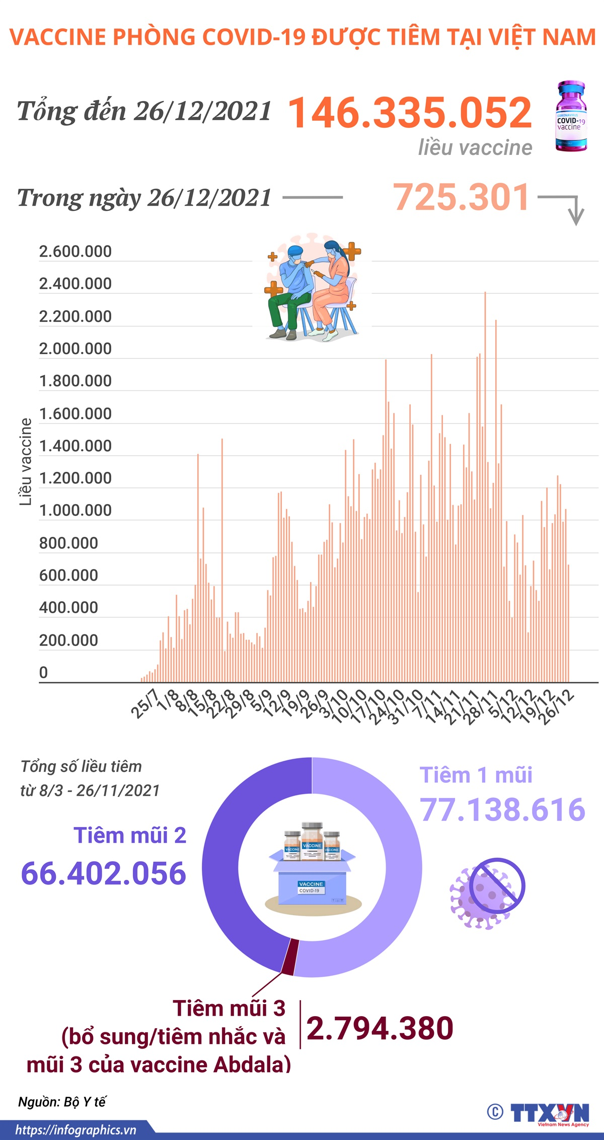 Trong ngày 26/12/2021 có 725.301 liều vaccine phòng COVID-19 được tiêm. Như vậy, tổng số liều vaccine đã được tiêm tại Việt Nam là 146.335.052 liều, trong đó tiêm 1 mũi là 77.138.616 liều, tiêm mũi 2 là 66.402.056 và tiêm mũi 3 (tiêm bổ sung/tiêm nhắc và mũi 3 của vaccine Abdala) là 2.794.380 liều.