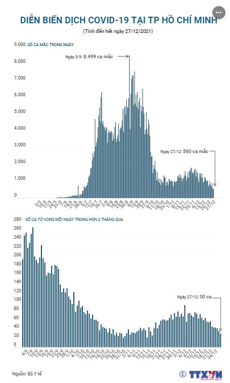 Trong những ngày gần đây, số ca mắc COVID-19 tại TP Hồ Chí Minh liên tục giảm mạnh. Trong ngày 27/12/2021, TP Hồ Chí Minh ghi nhận 560 ca mắc và 30 ca tử vong. Đây là một trong những ngày có ca mắc và tử vong thấp nhất trong suốt hơn 5 tháng qua. Theo Bộ Y tế, trong đợt dịch thứ 4, TP Hồ Chí Minh đã có tổng 500.617 ca mắc COVID-19, là địa phương ghi nhận số ca mắc cao nhất và mức độ lây nhiễm nghiêm trọng nhất cả nước.