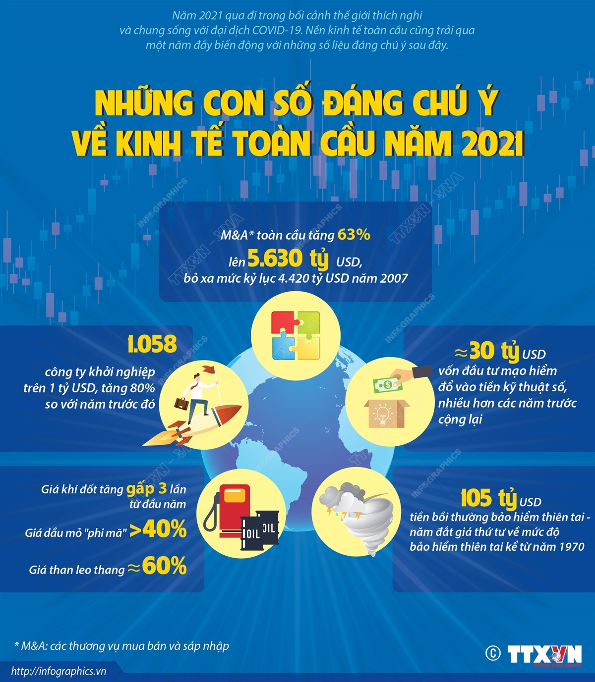 Năm 2021 qua đi trong bối cảnh thế giới thích nghi và chung sống với đại dịch COVID-19. Nền kinh tế toàn cầu cũng trải qua một năm đầy biến động với những số liệu đáng chú ý sau đây.