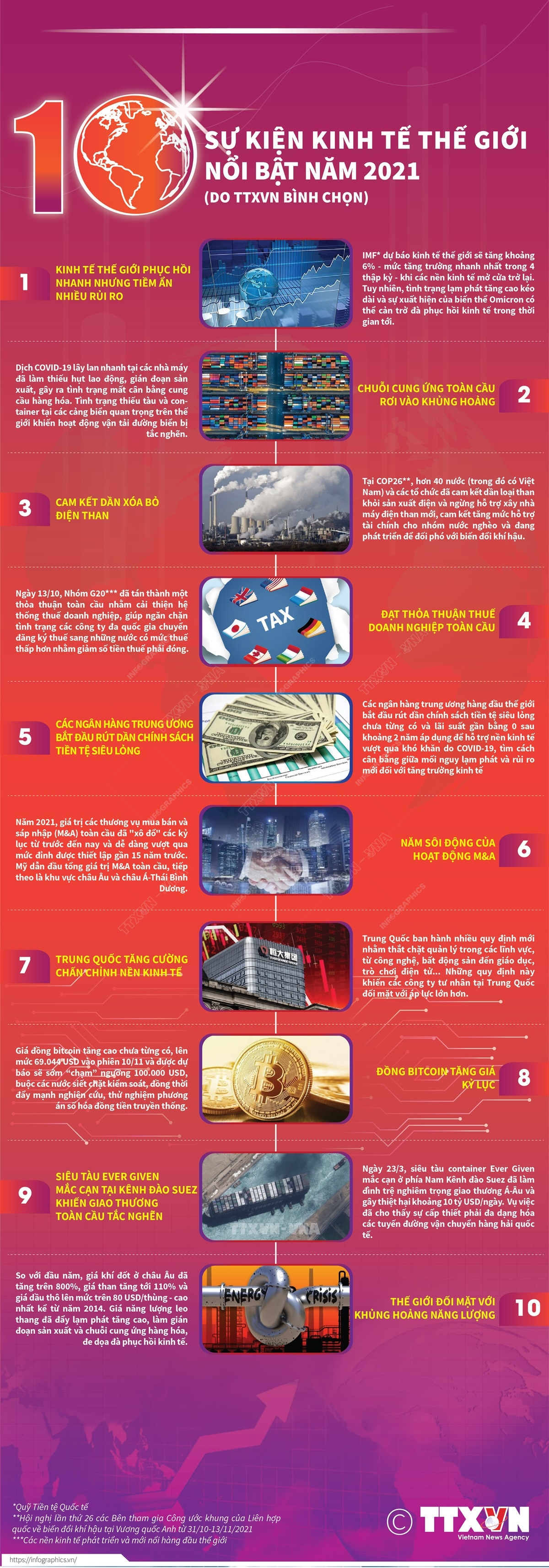 Kinh tế thế giới phục hồi nhanh nhưng tiềm ẩn nhiều rủi ro, Chuỗi cung ứng toàn cầu rơi vào khủng hoảng, Cam kết dần xóa bỏ điện than, Đạt thỏa thuận thuế doanh nghiệp toàn cầu… là những sự kiện kinh tế Việt Nam nổi bật năm 2021 do Thông tấn xã Việt Nam bình chọn.