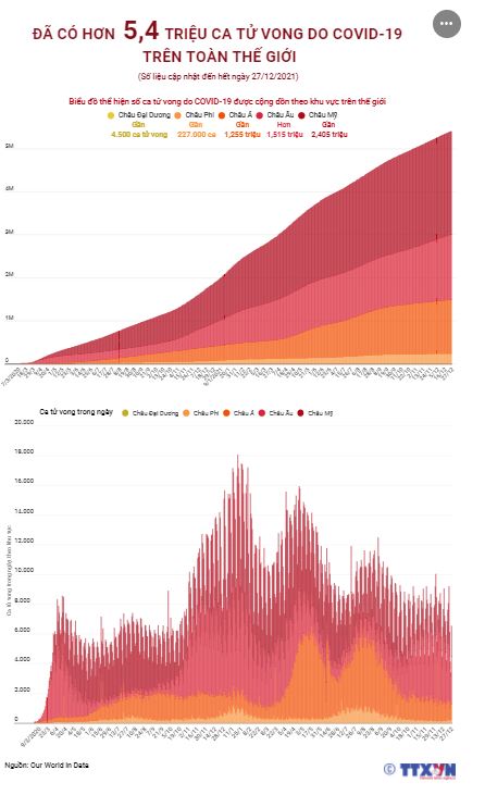 Sau 2 năm đại dịch COVID-19 bùng phát, số ca tử vong do COVID-19 trên toàn thế giới đã vượt 5,4 triệu người. Xét về tổng số tử vong do COVID-19, châu Mỹ vẫn là nơi có số ca tử vong cao nhất các khu vực, với hơn 2,4 triệu ca tiếp đến là châu Âu với hơn 1,51 triệu ca châu Á hơn 1,25 triệu ca... Trên phạm vi toàn cầu, COVID-19 hiện là nguyên nhân gây tử vong đứng hàng thứ ba, sau bệnh tim và đột quỵ.