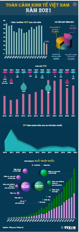 Tổng sản phẩm trong nước (GDP) năm 2021 ước tính tăng 2,58% so với năm 2020. Trong bối cảnh dịch COVID-19 ảnh hưởng nghiêm trọng tới mọi lĩnh vực của nền kinh tế, đây là một thành công lớn của Việt Nam trong việc phòng chống dịch bệnh, duy trì sản xuất kinh doanh. Thu hút vốn đầu tư trực tiếp nước ngoài (FDI) phục hồi khi nhà đầu tư nước ngoài tiếp tục tin tưởng vào môi trường đầu tư của Việt Nam. CPI bình quân tăng 1,84% so với năm 2020, mức tăng bình quân năm thấp nhất kể từ năm 2016. Xuất nhập khẩu duy trì tốc độ tăng trưởng cao khi đạt 668,5 tỷ USD, tăng 22,6% so với năm trước.