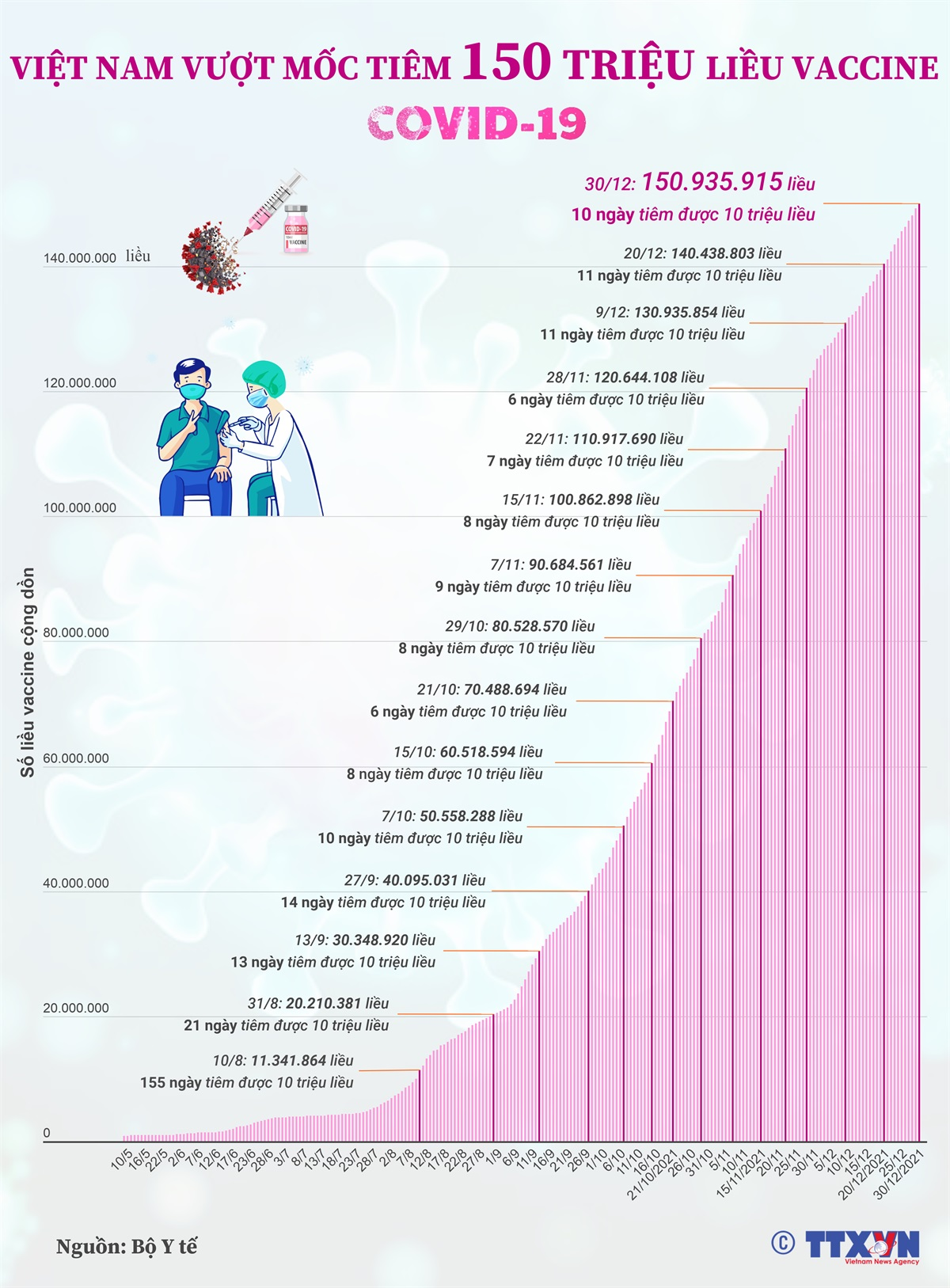 Tính tới ngày 30/12/2021, Việt Nam đã vượt hơn 150,9 triệu liều tiêm vaccine phòng COVID-19. Tổng số tiêm 1 mũi là 77.555.511 liều, tiêm mũi 2 là 68.435.813 và tiêm mũi 3 (tiêm bổ sung/tiêm nhắc và mũi 3 của vaccine Abdala) là 4.944.591 liều.. Riêng trong ngày 30/12/2021 có 1.964.508 liều vaccine phòng COVID-19 được tiêm.