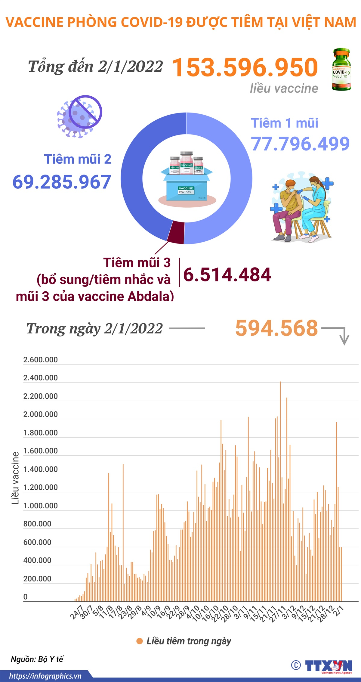 Trong ngày 2/1/2022 có 594.568 liều vaccine phòng COVID-19 được tiêm. Như vậy, tổng số liều vaccine đã được tiêm tại Việt Nam là 153.596.950 liều, trong đó tiêm 1 mũi là 77.796.499 liều, tiêm mũi 2 là 69.285.967 và tiêm mũi 3 (tiêm bổ sung/tiêm nhắc và mũi 3 của vaccine Abdala) là 6.514.484 liều.