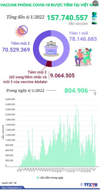 Trong ngày 6/1/2022 có 804.906 liều vaccine phòng COVID-19 được tiêm. Như vậy, tổng số liều vaccine đã được tiêm tại Việt Nam là 157.740.557 liều, trong đó tiêm 1 mũi là 78.146.683 liều, tiêm mũi 2 là 70.529.369 và tiêm mũi 3 (tiêm bổ sung/tiêm nhắc và mũi 3 của vaccine Abdala) là 9.064.505 liều.