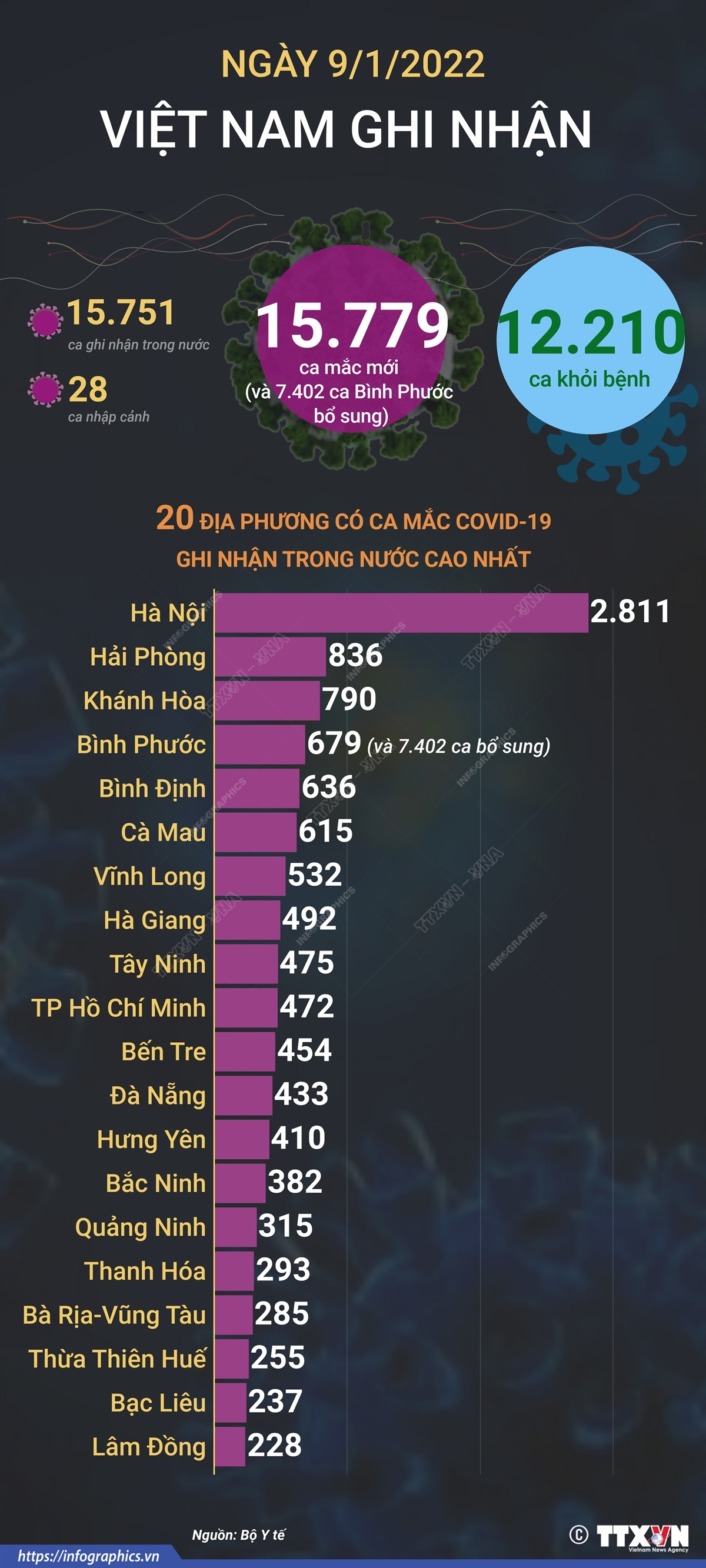 Tính từ 16h ngày 8/1 đến 16h ngày 9/1/2022, Việt Nam ghi nhận 15.779 ca mắc mới COVID-19, trong đó 28 ca nhập cảnh và 15.751 ca trong nước tại 60 tỉnh, thành phố