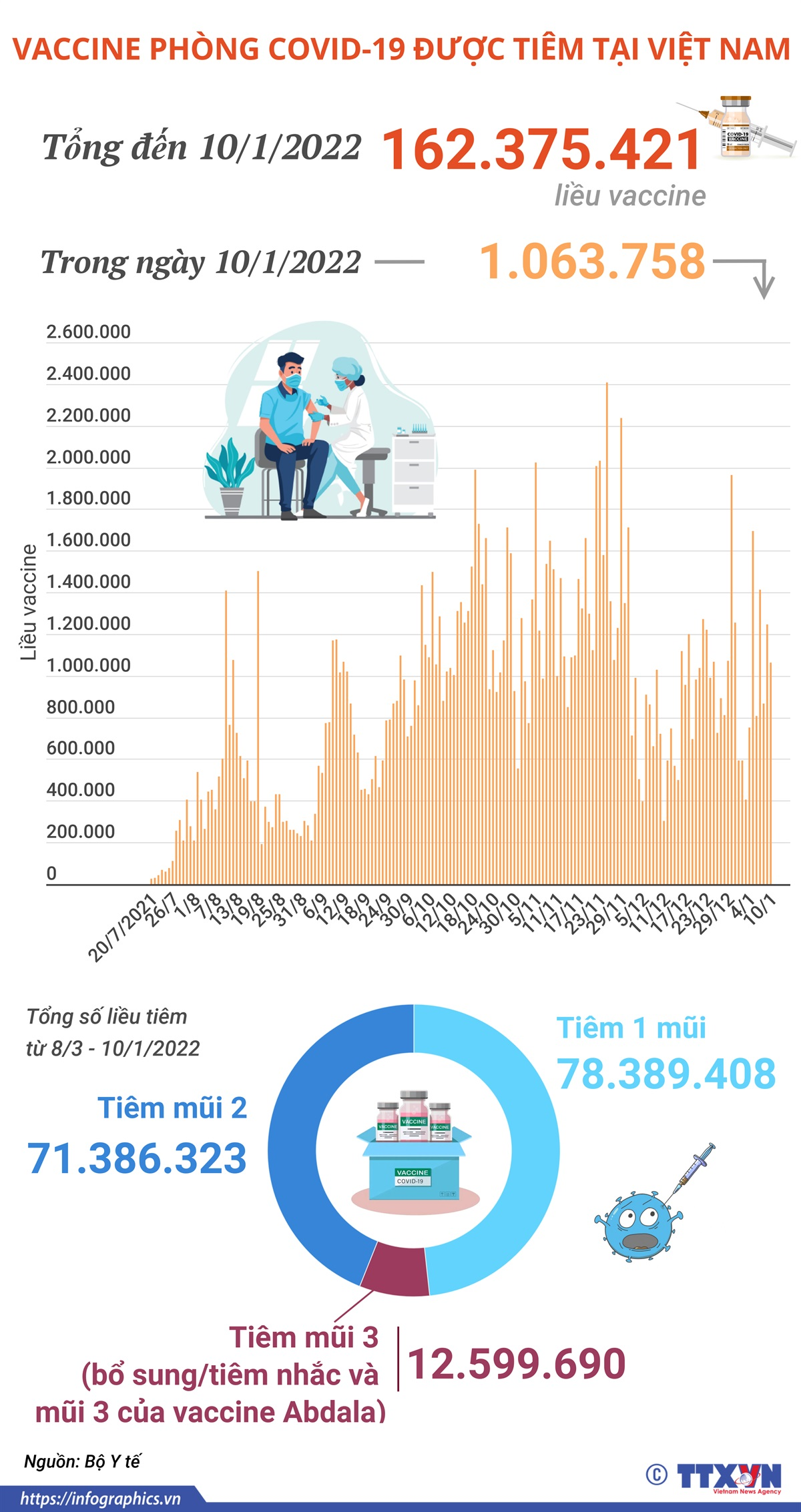 Trong ngày 10/1/2022 có 1.063.758 liều vaccine phòng COVID-19 được tiêm. Như vậy, tổng số liều vaccine đã được tiêm tại Việt Nam là 162.375.421 liều, trong đó tiêm 1 mũi là 78.389.408 liều, tiêm mũi 2 là 71.386.323 và tiêm mũi 3 (tiêm bổ sung/tiêm nhắc và mũi 3 của vaccine Abdala) là 12.599.690 liều.