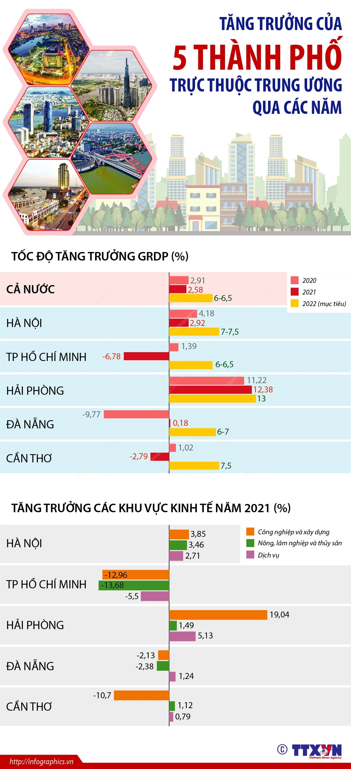 Trong 5 thành phố trực thuộc Trung ương, Hải Phòng là địa phương có tốc độ tăng tổng sản phẩm trên địa bàn (GRDP) năm 2021 dẫn đầu cả nước, đạt 12,38% và là 1 trong 2 tỉnh, thành phố có tăng trưởng đạt hai con số.