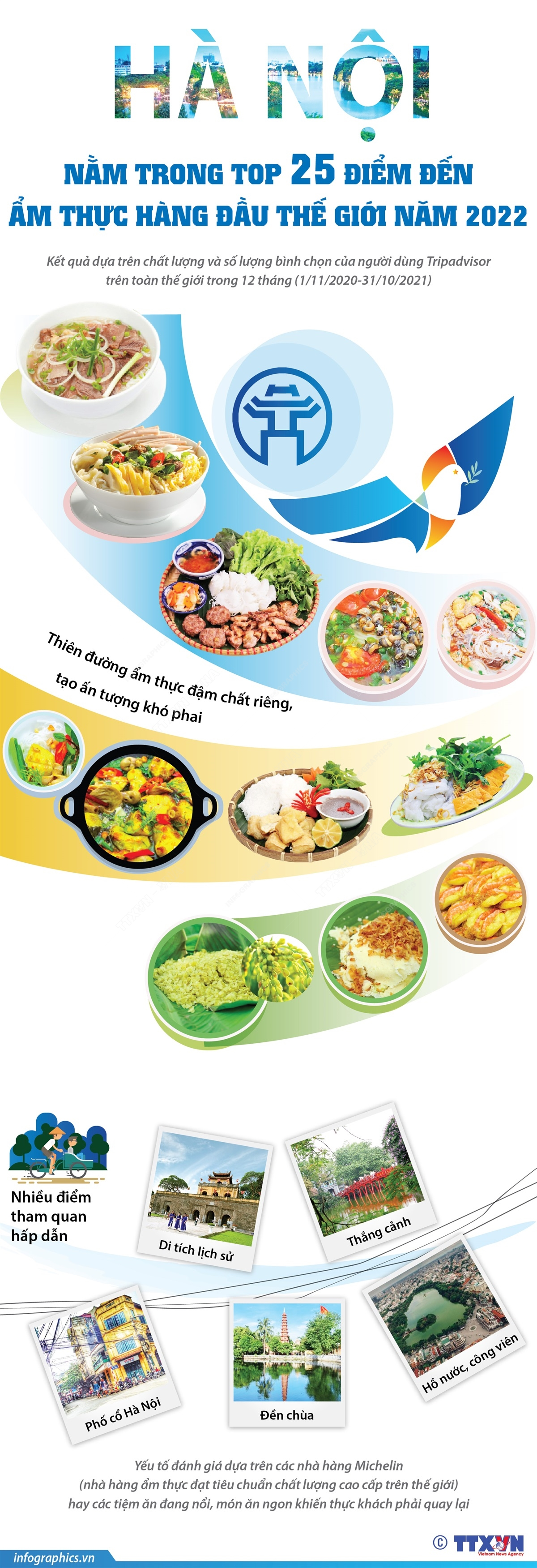 Hà Nội vừa được tôn vinh trong top 25 điểm đến ẩm thực hàng đầu thế giới năm 2022 do người dùng trang du lịch nổi tiếng Tripadvisor bình chọn. Kết quả bình chọn dựa trên hàng triệu đánh giá và ý kiến của du khách trên toàn thế giới.