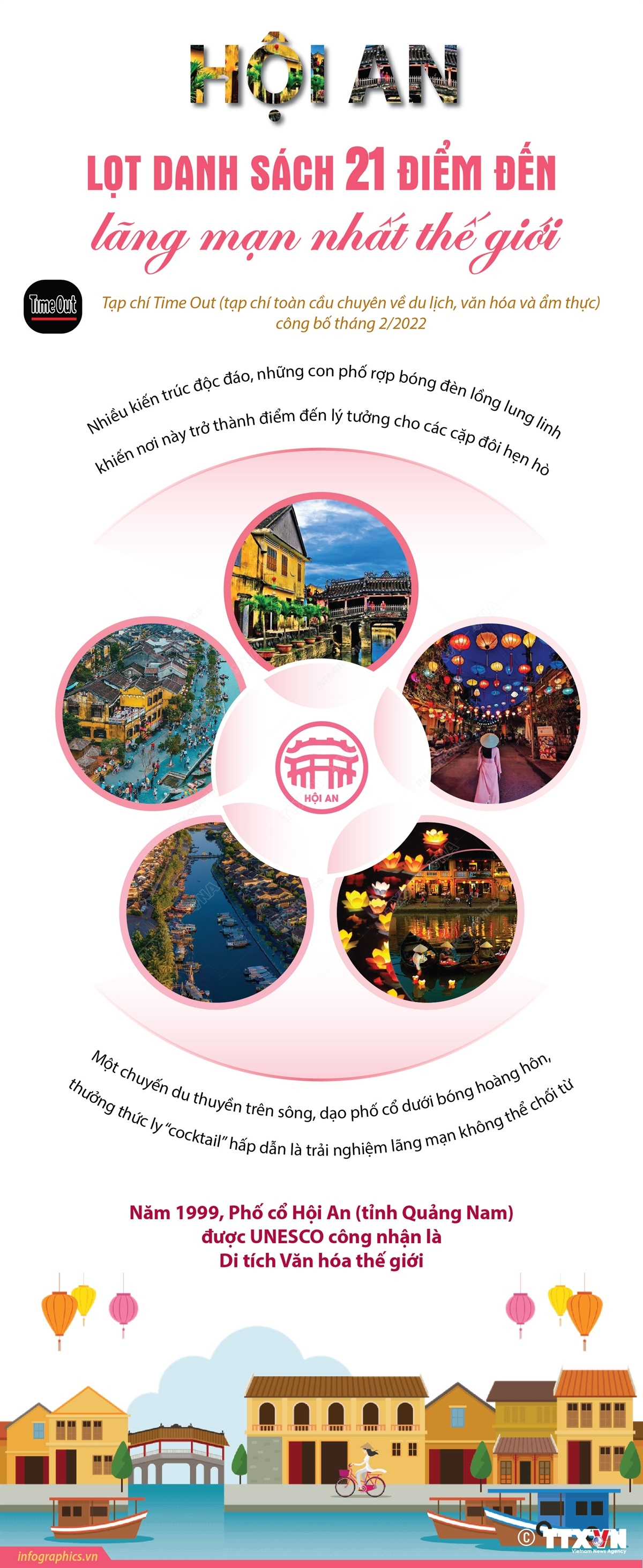 Thành phố Hội An (tỉnh Quảng Nam) vừa lọt vào danh sách 21 điểm đến lãng mạn nhất thế giới do tạp chí toàn cầu chuyên về du lịch, văn hóa và ẩm thực Time Out công bố. Phố cổ Hội An được UNESCO công nhận là Di tích Văn hóa thế giới năm 1999 và nhiều lần được các tổ chức, tạp chí danh tiếng khác trên thế giới bình chọn là điểm đến đô thị hàng đầu về văn hóa ở châu Á, top 15 thành phố tuyệt vời nhất châu Á, top điểm đến phổ biến nhất thế giới...