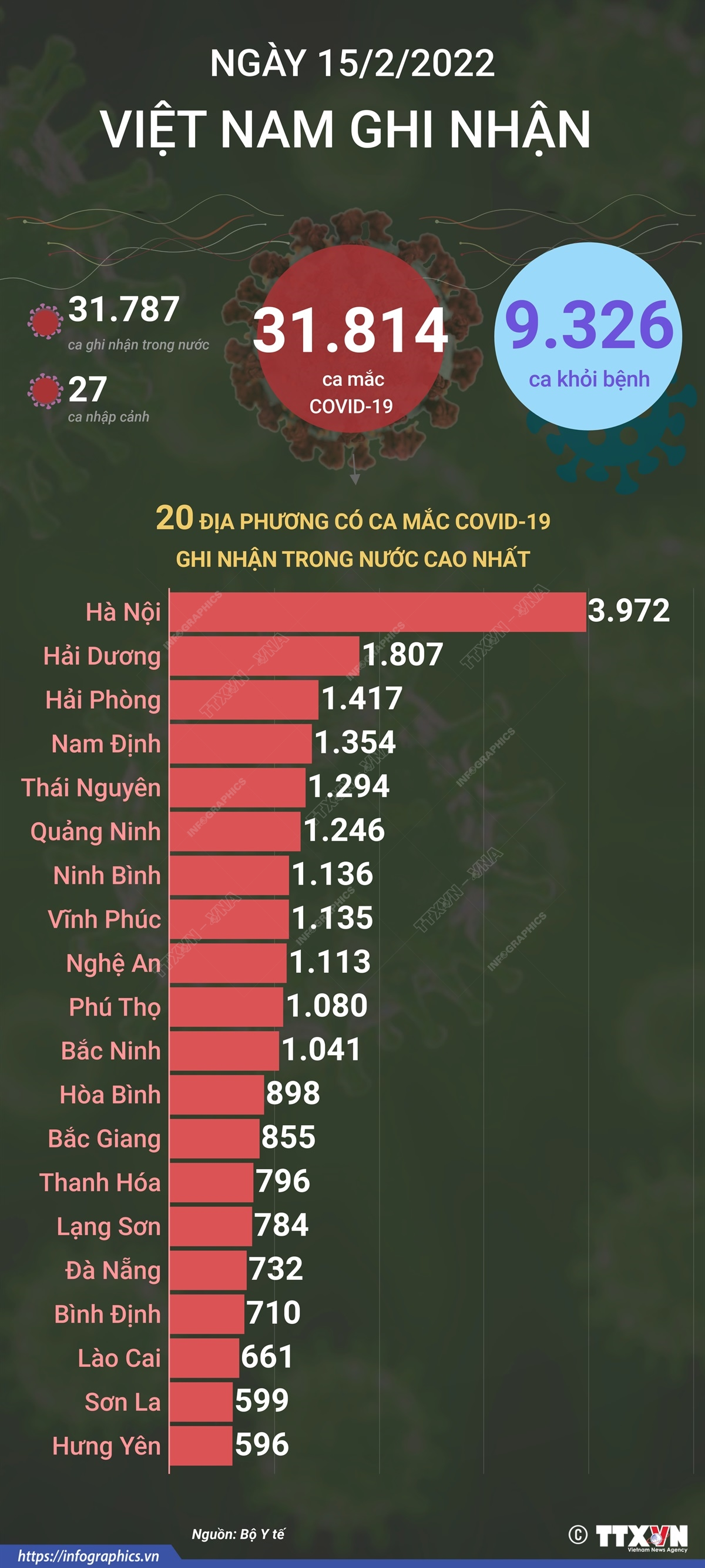 Tính từ 16h ngày 14/2 đến 16h ngày 15/2/2022, Việt Nam ghi nhận 31.814 ca mắc mới COVID-19, trong đó 27 ca nhập cảnh và 31.787 ca trong nước tại 62 tỉnh, thành phố.