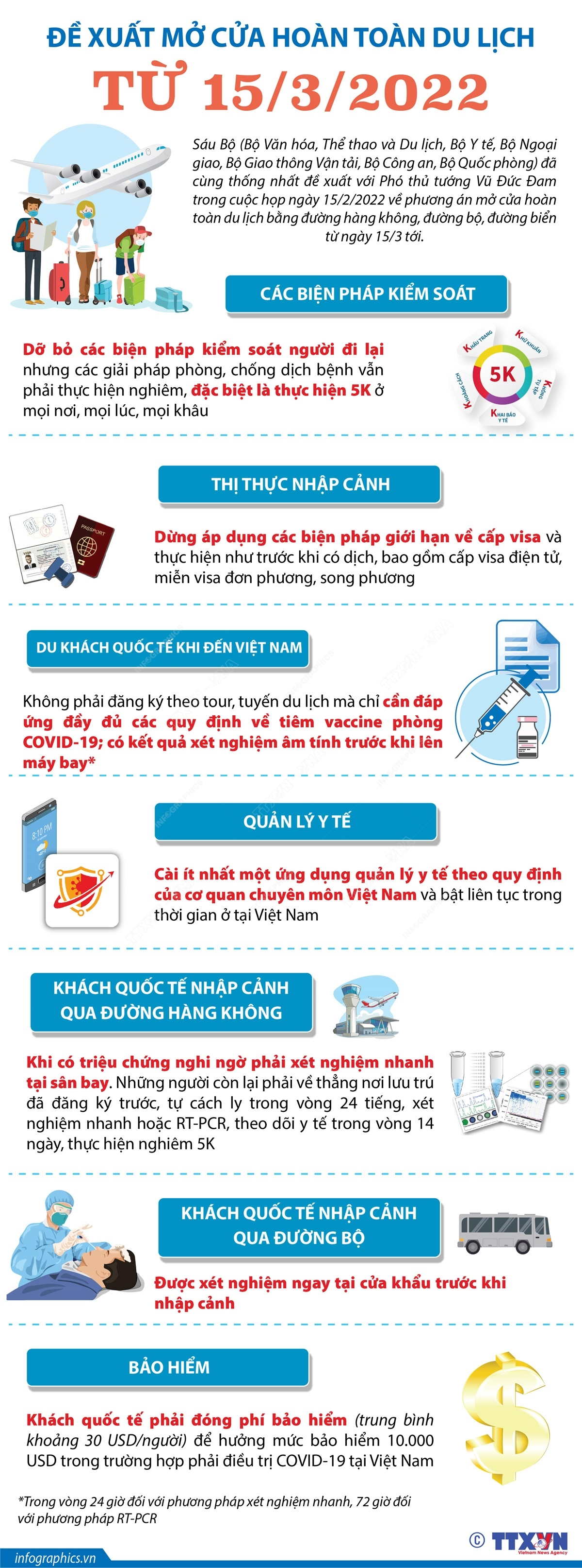 Sáu Bộ (Bộ Văn hóa, Thể thao và Du lịch, Bộ Y tế, Bộ Ngoại giao, Bộ Giao thông Vận tải, Bộ Công an, Bộ Quốc phòng) đã cùng thống nhất đề xuất với Phó Thủ tướng Vũ Đức Đam trong cuộc họp ngày 15/2/2022 về phương án mở cửa hoàn toàn du lịch bằng đường hàng không, đường bộ, đường biển từ ngày 15/3 tới.
