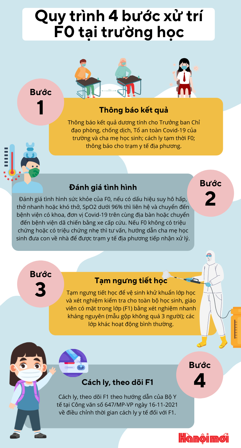 Bộ Giáo dục và Đào tạo đã ban hành Sổ tay bảo đảm an toàn phòng, chống dịch trong trường học (sửa đổi, bổ sung) được phê duyệt kèm theo Quyết định số 406/QĐ-BGDĐT ngày 27-1-2022, trong đó có nêu rõ quy trình xử trí F0 tại trường học với 4 bước cụ thể, để các đơn vị thực hiện thống nhất.