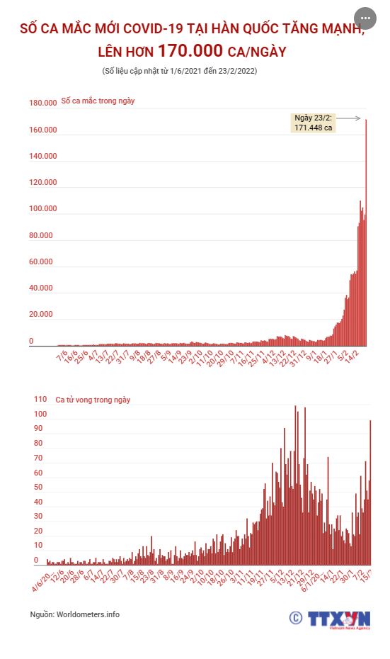 Theo trang worldometers.info, ngày 23/2/2022, Hàn Quốc ghi nhận 171.448 ca mắc mới COVID-19, cao nhất từ trước đến nay và tăng mạnh so với một ngày trước đó (99.550 ca ngày 22/2). Số ca tử vong do COVID-19 cũng tăng mạnh, lên đến 99 ca, gần chạm mức kỷ lục.