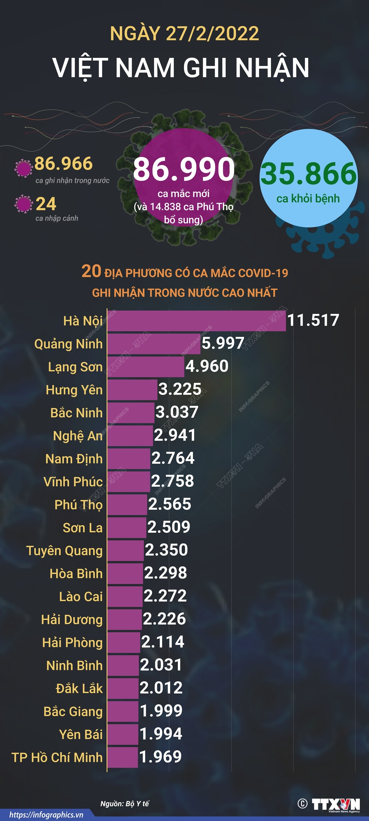 Tính từ 16h ngày 26/2 đến 16h ngày 27/2/2022, Việt Nam ghi nhận 86.990 ca mắc mới COVID-19, trong đó 24 ca nhập cảnh và 86.966 ca trong nước tại 61 tỉnh, thành phố.