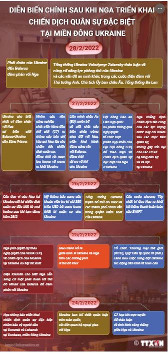 Hãng Sputniknews ngày 28/2/2022 đưa tin phái đoàn của Ukraine đã có mặt ở Belarus để tiến hành đàm phán với Nga. Chuyến đi được thực hiện một ngày sau khi Tổng thống Ukraine Volodymyr Zelensky khẳng định ông cần tận dụng mọi cơ hội để đảm bảo hòa bình cho Ukraine. Sau đây là những diễn biến chính sau khi Nga thông báo triển khai chiến dịch quân sự đặc biệt nhằm bảo vệ người dân tại Donetsk và Luhansk tại Donbass, miền Đông Ukraine.