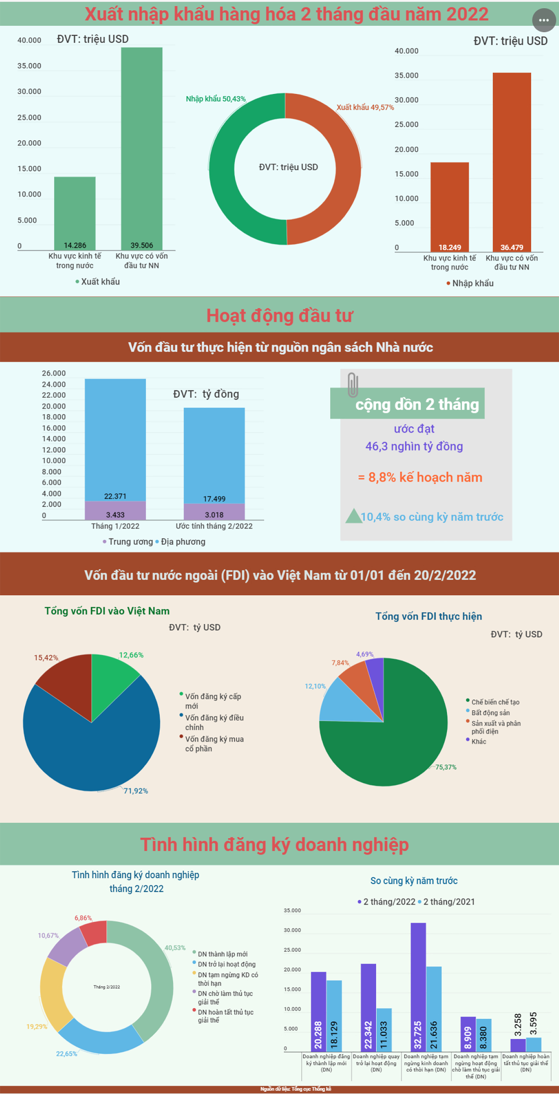 Theo số liệu của Tổng cục Thống kê công bố ngày 28/2, tính chung 2 tháng đầu năm 2022, kim ngạch xuất khẩu hàng hóa ước đạt 53,79 tỷ USD, tăng 10,2% so với cùng kỳ năm trước.