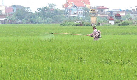 Nông dân xã Đông Xuân phun thuốc trừ sâu bảo vệ lúa mùa.