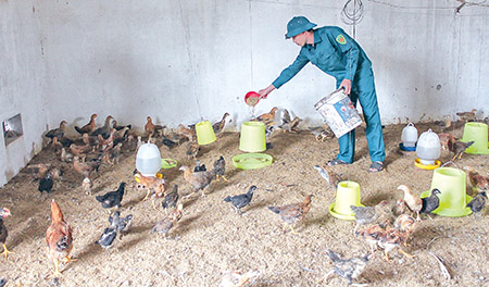 Nhân viên Đội tăng gia sản xuất chăm sóc đàn gà.