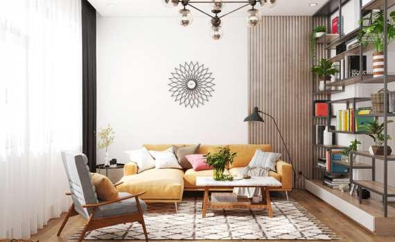 Ghế sofa chữ L đánh dấu khu vực tiếp khách hiện đại và trẻ trung. Một chiếc kệ mở đặt bên cạnh để gia chủ trưng bày sách và các vật dụng trang trí trong phòng.