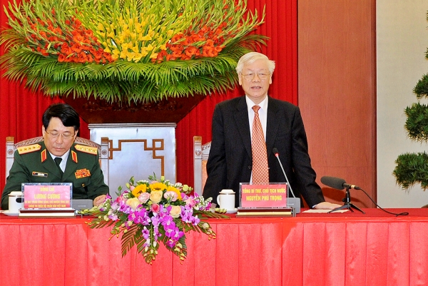 Tổng Bí thư, Chủ tịch nước Nguyễn Phú Trọng nhấn mạnh, chúng ta tự hào về đất nước, về Đảng, về nhân dân, về quân đội anh hùng, tin tưởng vào sự lãnh đạo của Đảng, đoàn kết một lòng. Đối với cán bộ, chiến sĩ trong toàn quân hãy luôn phát huy cao độ bản chất cách mạng, phẩm chất cao đẹp “bộ đội Cụ Hồ”, truyền thống anh hùng, đoàn kết, thống nhất cao, đi đầu trên tất cả các lĩnh vực, gắn bó mật thiết với nhân dân anh hùng; phối hợp tốt với lực lượng công an, giữ vững an ninh chính trị và trật tự an toàn xã hội. Có như thế mới xây dựng đất nước không ngừng phát triển trường tồn, sánh vai với các cường quốc năm châu. Đối với các điển hình, tiên tiến, các đồng chí cần ghi nhớ lời Bác Hồ dạy “Một tấm gương sống còn giá trị hơn một trăm bài diễn văn tuyên truyền”, ra sức học tập, tiến bộ và hoàn thiện hơn để nhiều người học tập noi theo.