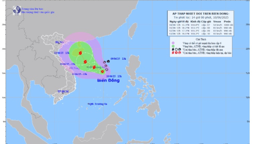 Trong 24h tới: Áp thấp nhiệt đới di chuyển theo hướng Tây Tây Bắc, tốc độ 5–10km/h. Đến 13h ngày 11/6, tâm áp thấp nhiệt đới ở khoảng 16,2°N - 113,1°E, ngay trên khu vực phía Đông quần đảo Hoàng Sa. Dự báo mạnh lên thành bão; Cường độ: Cấp 8, giật cấp 10. Vùng nguy hiểm trên biển (gió mạnh từ cấp 6 trở lên): Từ 13,0°N đến 19,0°N, từ 111,0°E đến 117,0°E