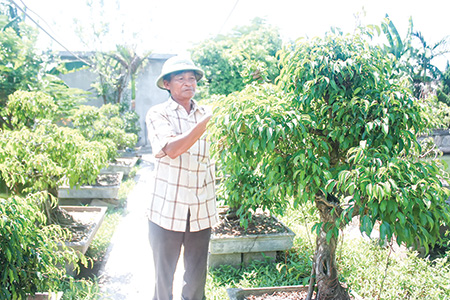 Cựu chiến binh Nguyễn Ngọc Quý (thôn An Nhân Bình, xã Bắc Hải, huyện Tiền Hải) chăm sóc cây cảnh trong trang trại.